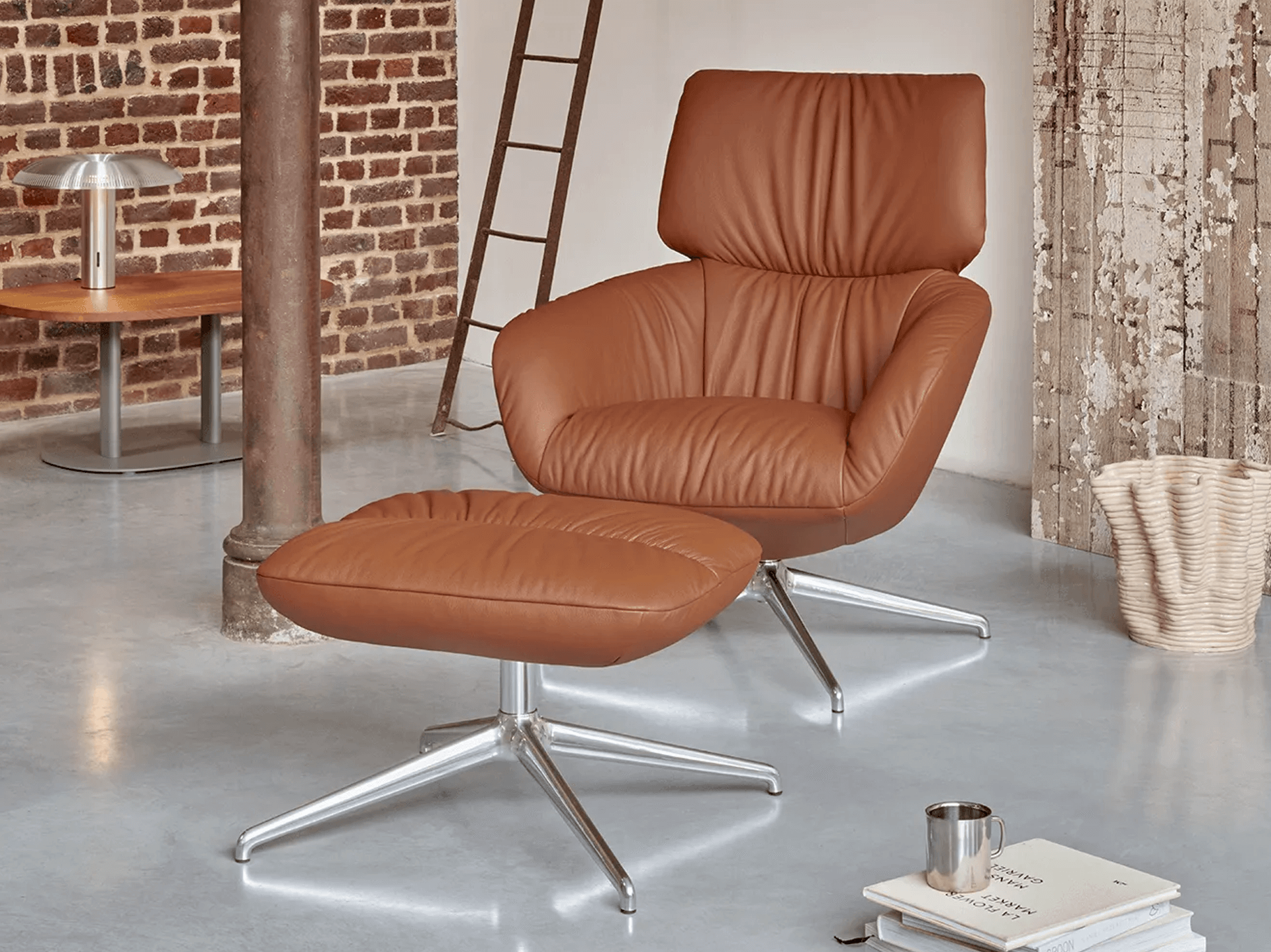 Een subtiel detail is de aluminium draaivoet die in elke Leolux-kleur kan worden uitgevoerd, net als de hendel voor de neigfunctie. Die hendel is voorzien van een handgreep in leer, ambachtelijk afgewerkt met een subtiele siersteek. Zulke details maken van de comfortfauteuil Lodey een smaakvol rustpunt in de woonkamer.